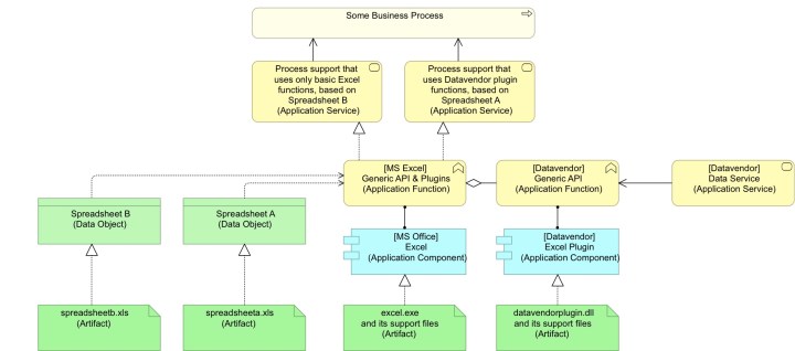So, the Excel application is an Application Component (realized by the excel.exe and all its support files at the infrastructure level) and the plugin is another Application Component (realized by another set of .dlls at the infrastructure level). Excel’s functionality loads the plugin’s functionality to become the aggregated “Generic API & Plugins” Application Function seen in the view above. (There are more ways to model this, e.g. I could have modeled an application interaction between both application functions, more on this later).