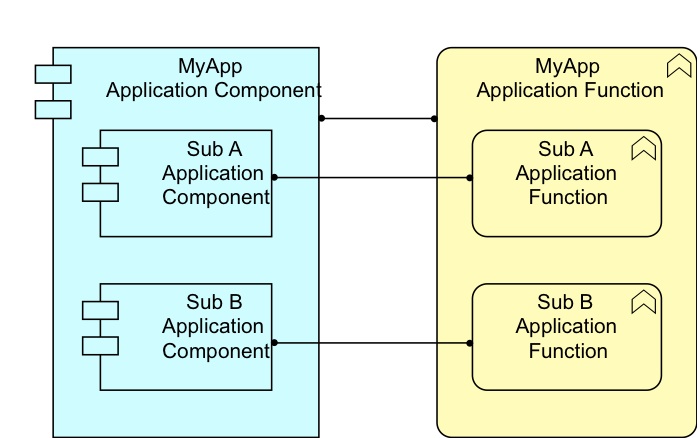 And what about grouping/encapsulating of Application Component and Application Function? Same here and even nicer. Because at the application level, ArchiMate kind of sees the same sort of ‘encapsulation’ on both sides. Application Function may be an encapsulation (by means of a composition) of other Application (sub)Functions and Application Component may be an encapsulation (by means of a composition) of other Application (sub)Components. Between the Application (sub)Functions and Application (sub)Components is a one-on-one Performed-By relation. As can be seen here in nested form: