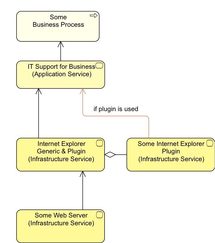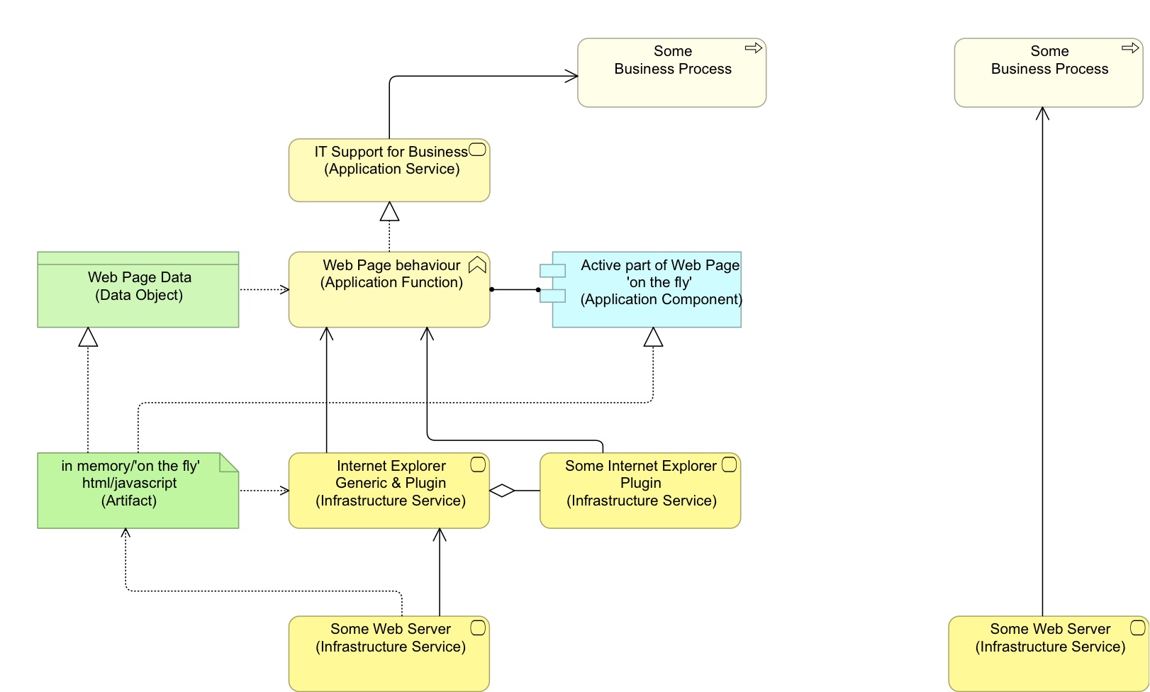 The question of course is: is it useful to model the state of affairs at this detailed level? In the previous post, about modeling spreadsheet use, my answer was a clear “yes”. Not modeling those ‘hidden’ spreadsheet applications is sloppy and it seriously undercuts the usability of your models for analysis. In this case, the situation is slightly different, though. The functionality remains inside the browser, if only because of security considerations. So, there will never be direct relations with other functions in your landscape. Modeling the on-the-fly objects may be the most correct way to do it, in terms of the uses of your models, you might do with less detail. What you at least do need to know is the dependency of the Business Process on the browser and its plugins and on the web server. I could personally live with a model without the passive and active objects and the Application Function that is performed by the on-the-fly Application Component. Then it would look like this: