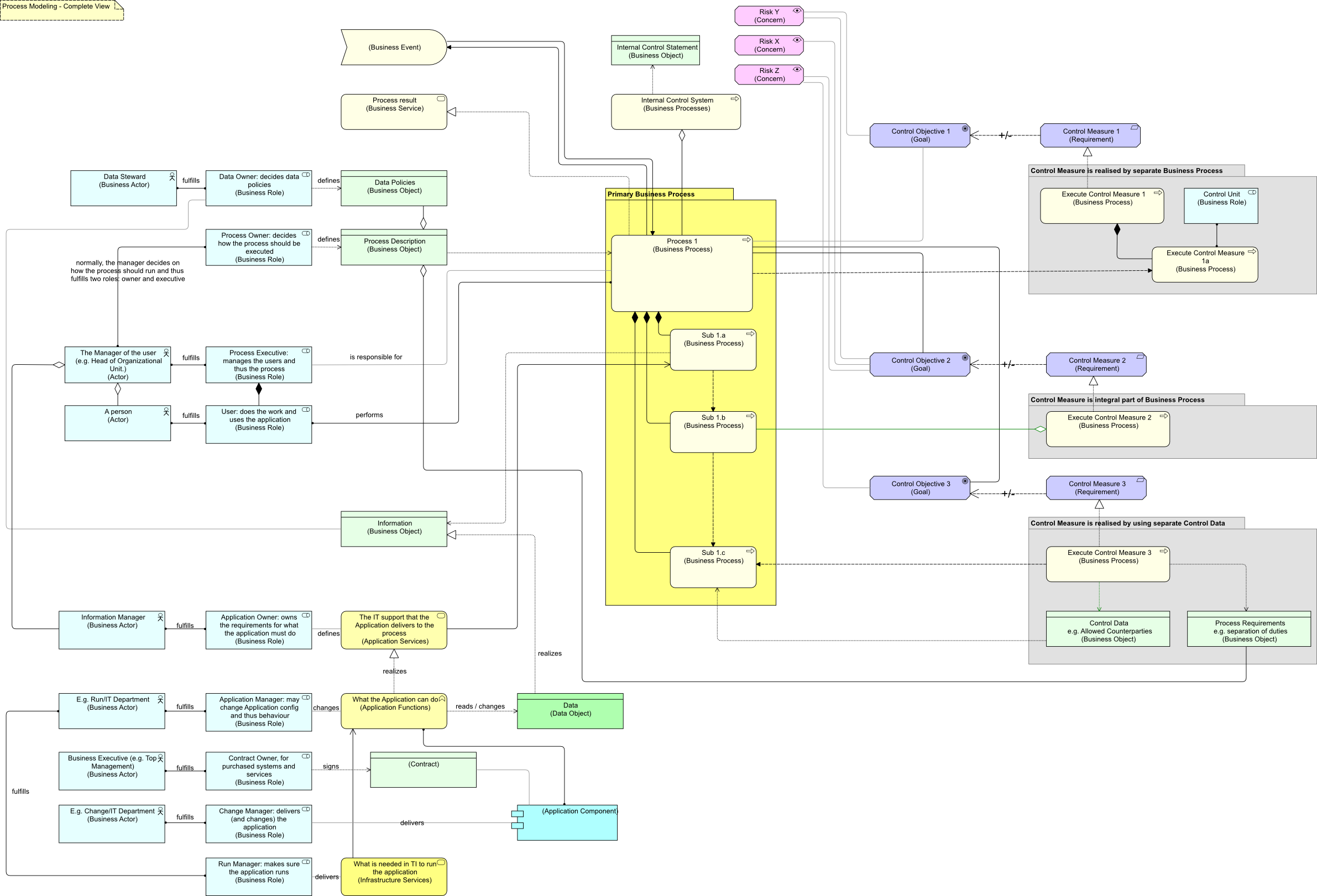 Here is a small bonus view integrating part of the story above and part of the previous post about modeling risk:Missing are the risks and countermeasures related to the IT-part. Here, also, only the relation between a process description and countermeasure process requirements has been drawn. But you can imagine that the Data Policies are (also) part of a countermeasure structure. And you can possibly imagine that if you can link risks to policies or functions to those who are responsible, you end up with a pretty powerful Current State Enterprise Architecture model to support managing and reporting on that complexity.