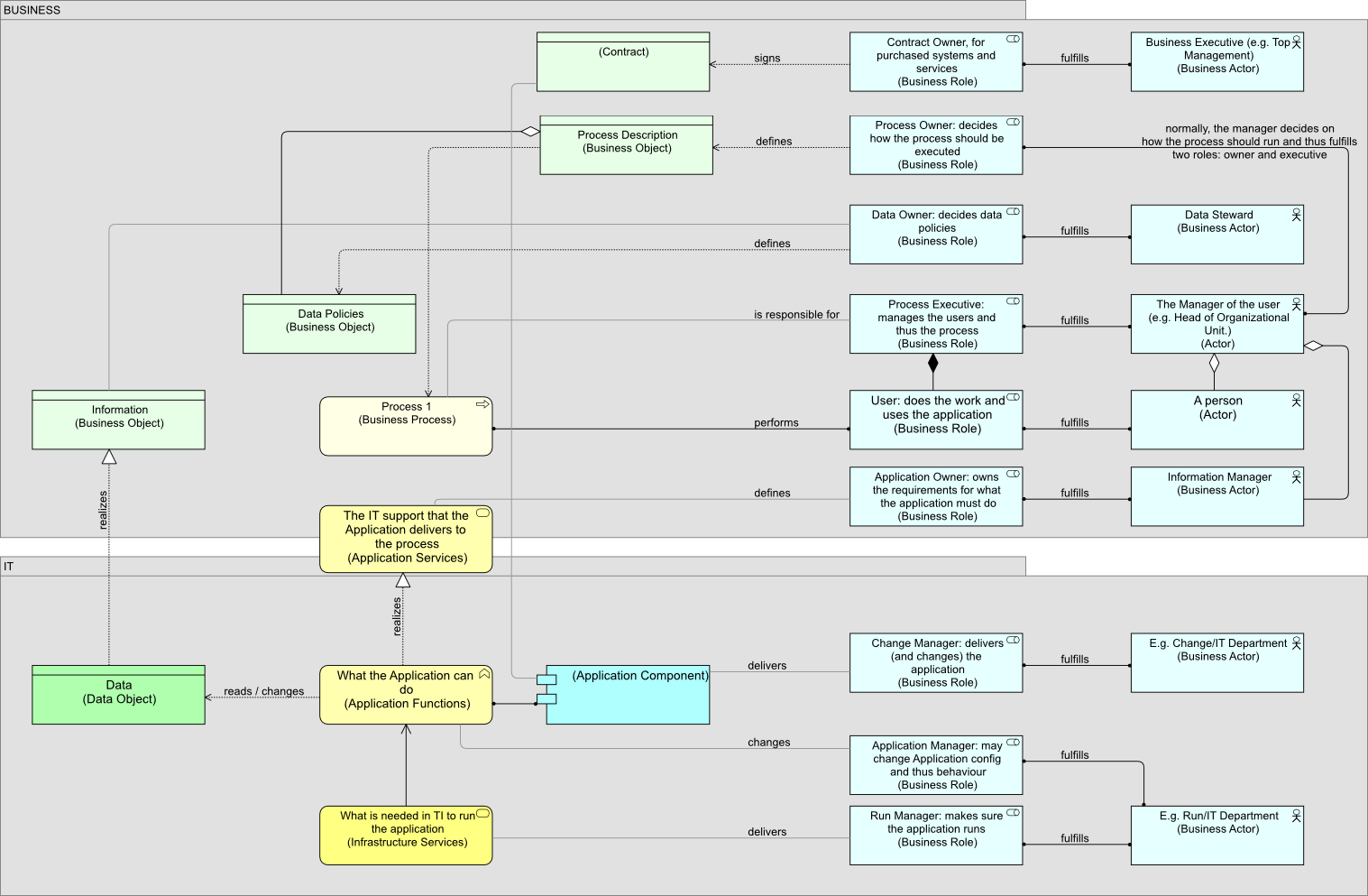 Note not everything is drawn here. If you look at the way the Data Owner’s responsibility is modeled (defines the Data Policies Business Object which is seen as an aggregated independent part of the Process Description), a likewise solution could be used for the Enterprise Architect, whose guidelines may be part of the application requirements and who was drawn in that earlier post. Or think of the Security Officer, whose requirements are an (independent, aggregated) part of Process Descriptions and Application Requirements.