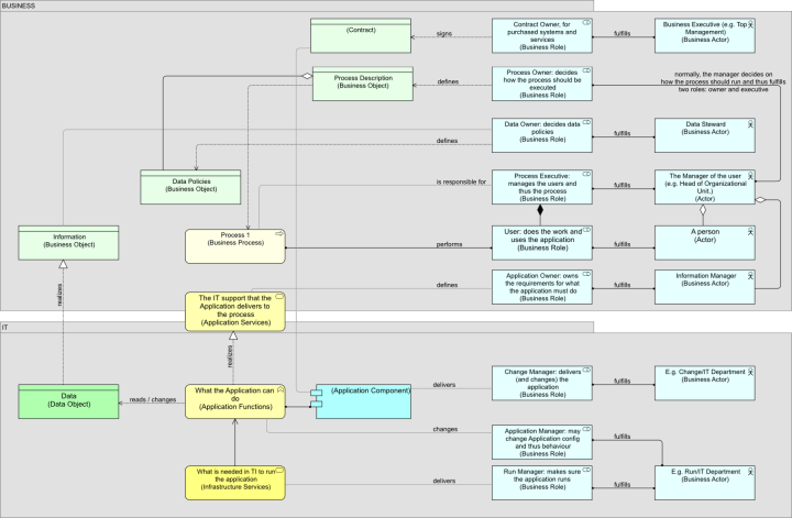 There are many organizational choices in this example view that could be made differently of course. For instance, in this example the manager of the department is both Process Executive and Process Owner and he supervises the Information Manager (and the User of course). But you could also have the Information Manager or someone else fulfill the role of Process Owner, even if the department head remains Process Executive. Many different organizational patterns are of course possible (though modeling them might show you clearly why some things won’t work, e.g. where you get schizophrenic accountabilities on application ownership or as we say in The Netherlands more than one captain on board). Having it set up like this, it is pretty simple to change this when business policies change.
