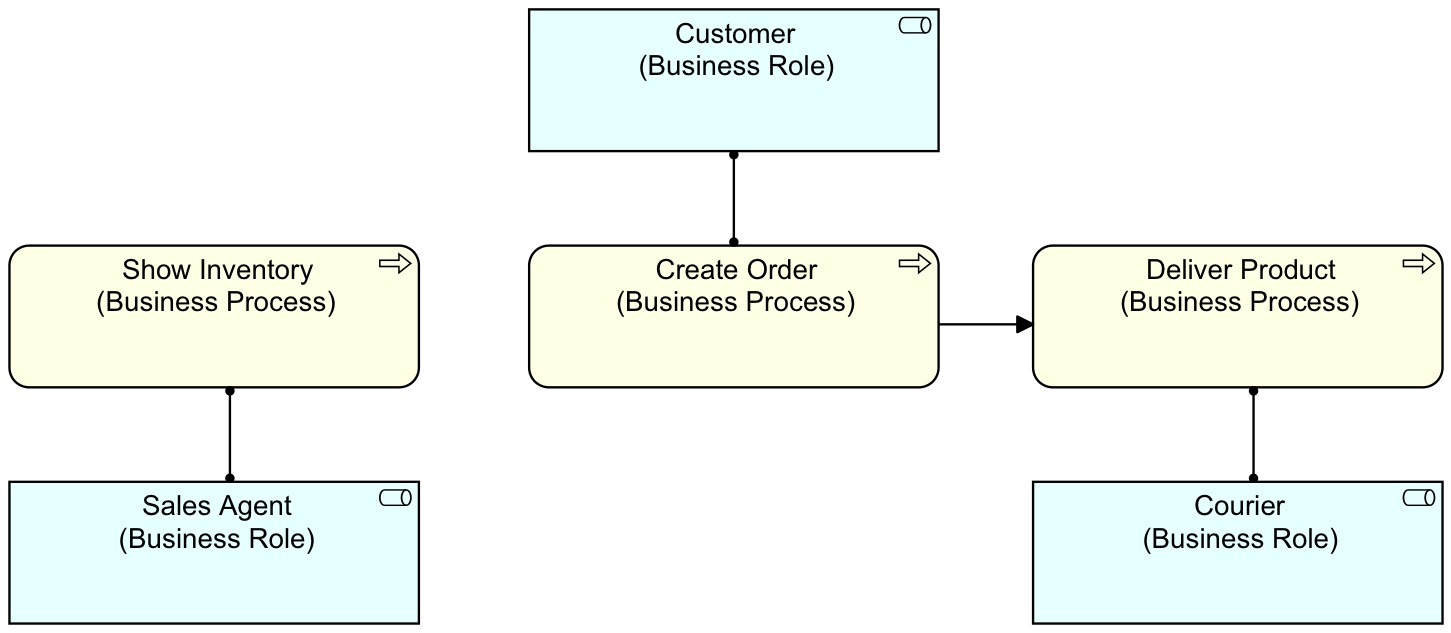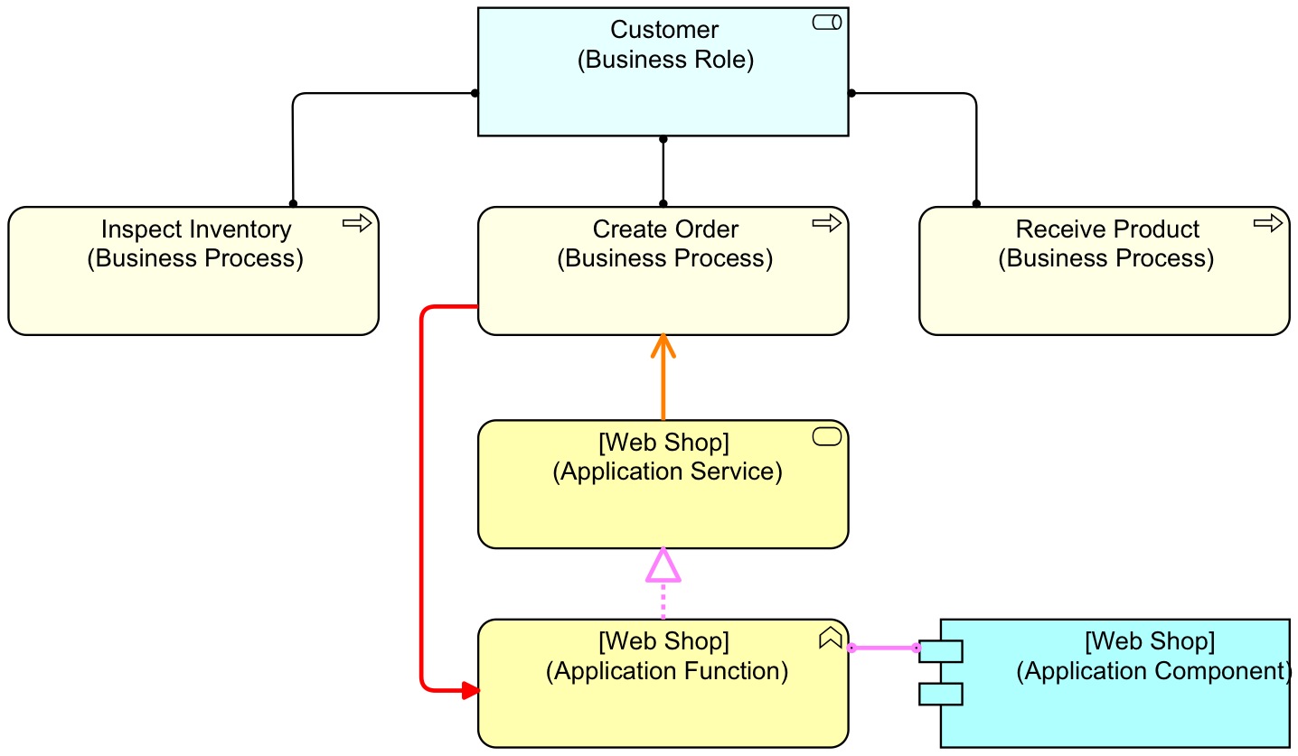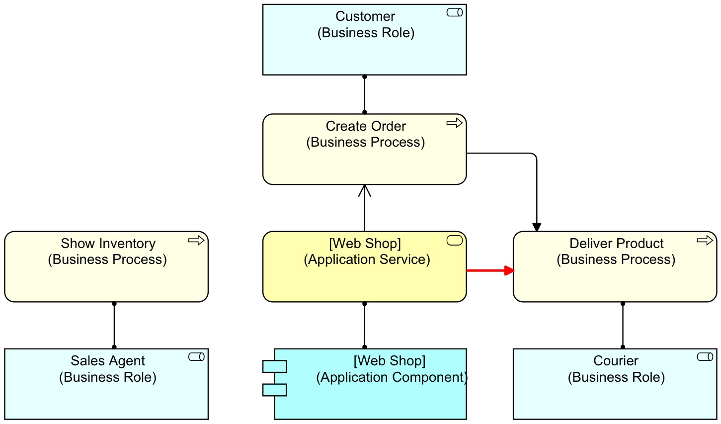CustomerSelfServiceWithoutBusinessServiceThe red Trigger relation is not allowed in ArchiMate (which I think is a restriction it should lose as triggering happens all over the layers, e.g. a server crashing may trigger a business process), so to keep showing the triggers we must draw them from Business Process to Business Process. By the way, yes I know it is weird that a Sales Agent shows inventory while the order is a web site, but please bear with me, this is about patterns, not about real situations.