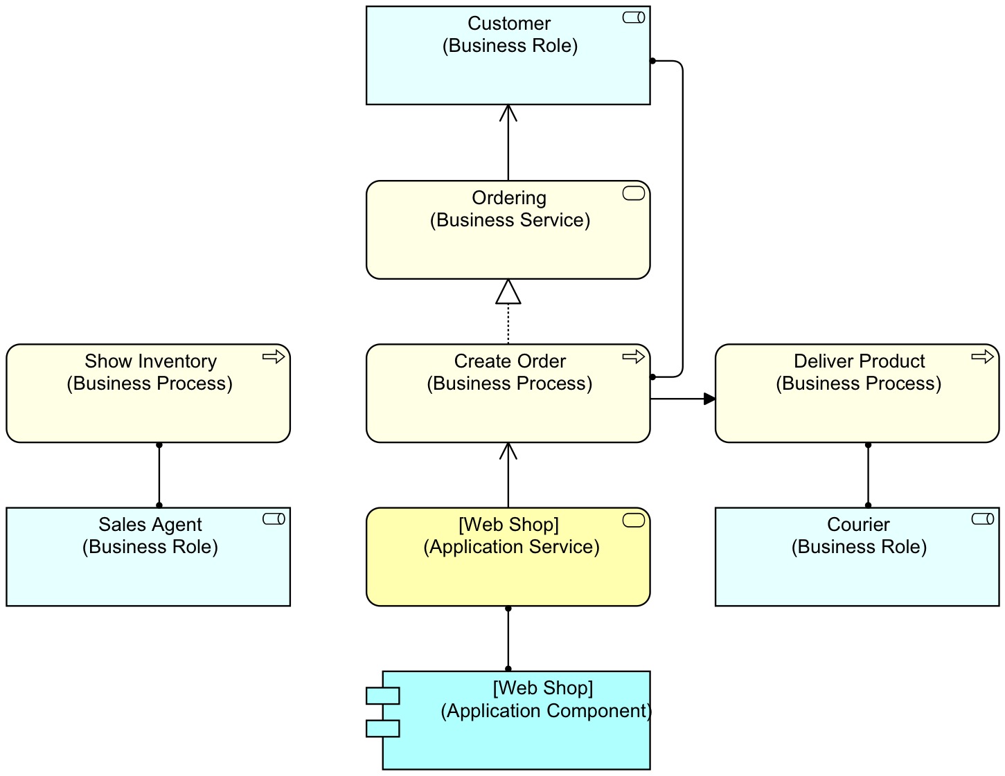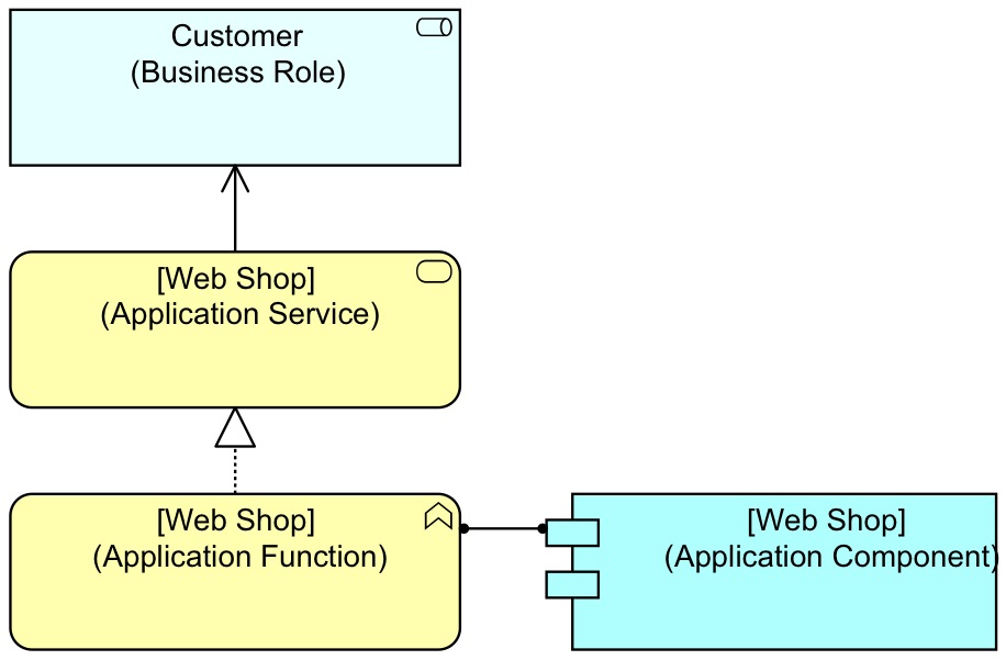 I am sorry but for me it is a little confusing when the model (for instance in the last diagram) contains three different elements (application component, application function and application service) each with the same name ‘[Web shop]’. What is the sense of elements named like this ?