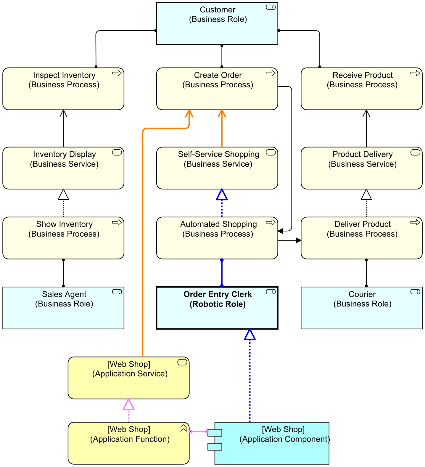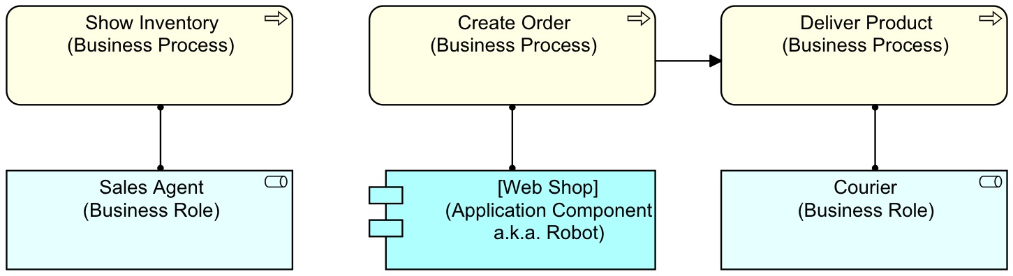 Warning: this is not valid ArchiMate (it is just something I would like). We create two different concurrent views on what is going on. From an application view, we can see that the customer’s process uses our web shop application, from a business perspective, we see that the customer is using our robot and we do not need to add applications as actors to the business perspective as we have robots.