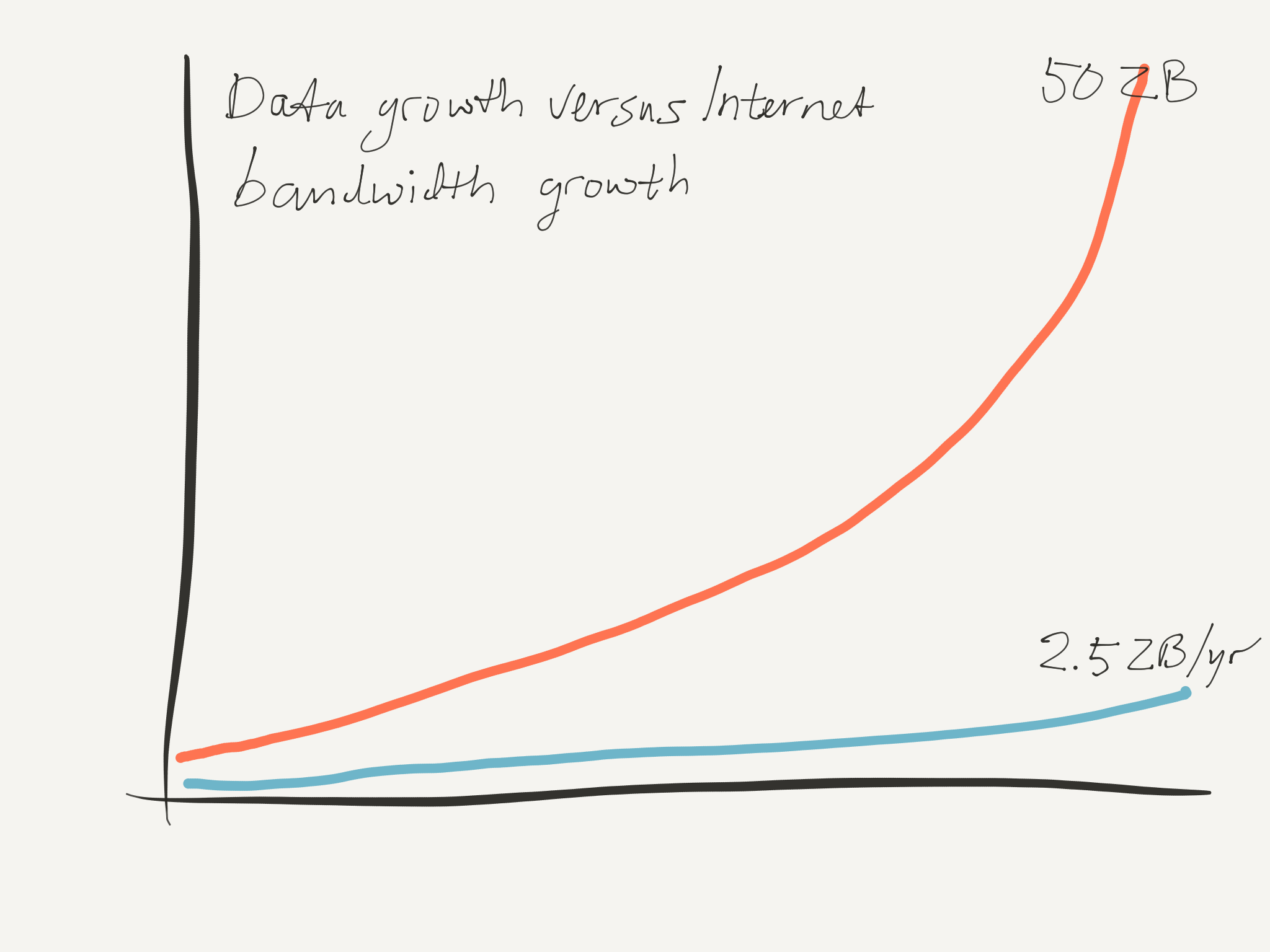 Now, the amount of data in the world is growing exponentially. If IDC is to be believed, in a few years’ time, the world is expected to store about 50ZB (zettabytes), or 50,000,000,000,000,000,000,000 bytes). On the other hand, while the total capacity of the Internet to move data around grows too, it does at a far more leisurely pace. In the same period that world data size grows to 50ZB, the total internet bandwidth will reach something like 2.5ZB per year (if Cisco is to be believed).