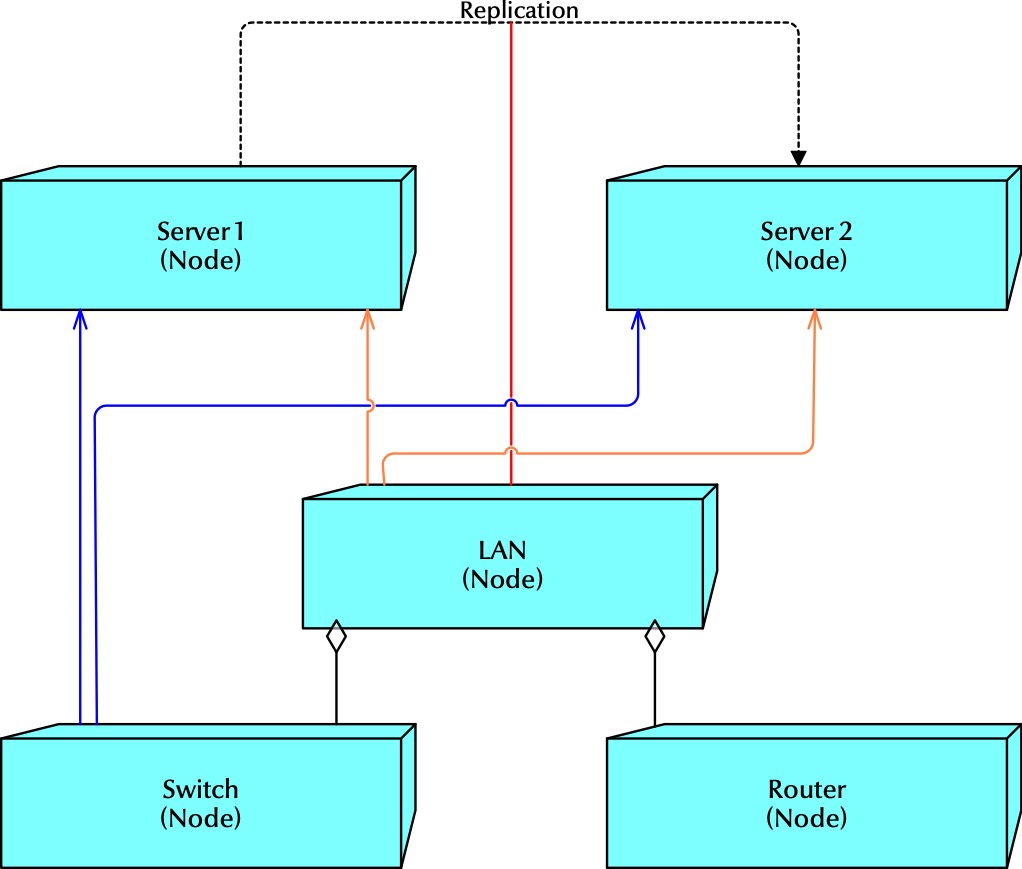 - Communication Network — an element representing physical network infrastructure, such as a LAN or WAN network (the old Network element, however it is connected (we will see how below) to Devices (digital gear) instead of Nodes.)