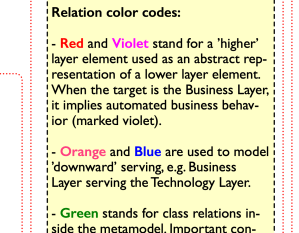 TOG claims (here) “The formalization of the derivation rules as mentioned above has had a minor impact on the metamodel structure, since some relationships can now be derived that formerly had to be specified explicitly in the metamodel.”, but in reality they left quite a few direct relations in, even if they can now be derived. E.g. the direct serving relation in a layer from a service to an active element, that was introduced in ArchiMate 2 because it could no longer be derived under changed derivation rules, can now be removed but is still there. That is not a big deal and in the end you can still model in the same way.
