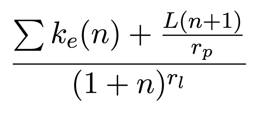 What this formula does is the following: We want to calculate how much knowledge in a certain subject is in play at the highest, strategic level of the organisation. It thus starts from the common orientation that there are levels (L) in the organisation and Level 0 is the CEO. The next Level is everybody who directly advises the CEO. These are the other board members, but also for instance that Chief Legal Counsel we used as an example before or an IT Board that directly advises the CEO. And so we go on in levels. The main formula for calculating the know how of the organisation at any level n is: