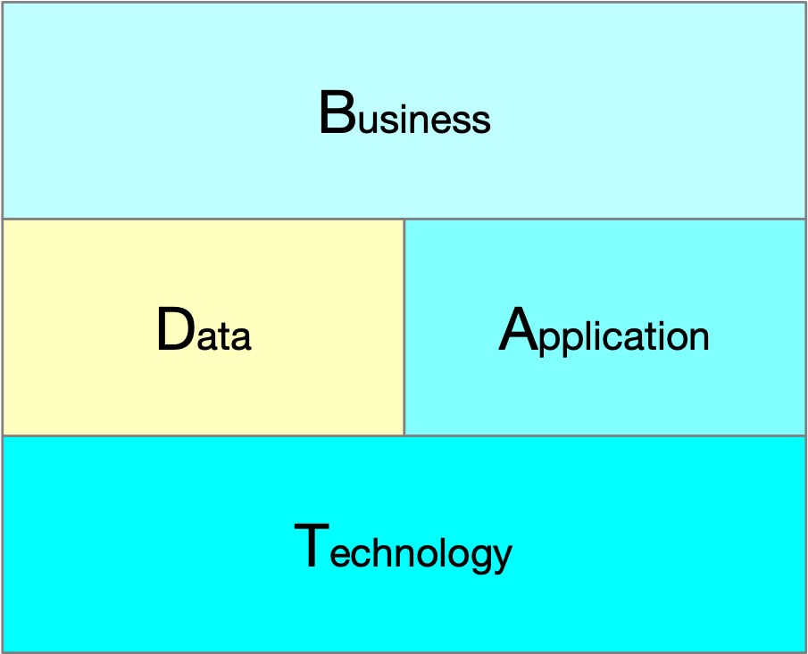 Because of the aforementioned waterfall, the classic/orthodox approach to model EA became the BDAT-stack, where BDAT stands for “Business, Data, Applications, Technology”. One basic form looks like this: