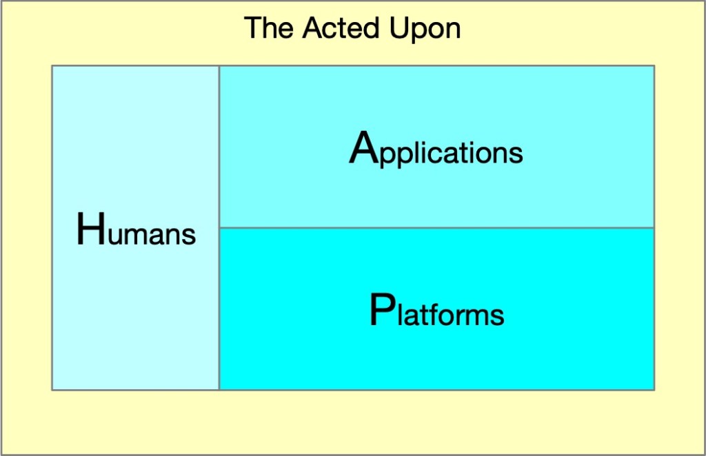 So far, we have focused on the ‘actors’ in an organisation. The original ‘BAT’ stack was extended to the ‘BDAT’ stack (mostly reflecting the growth of IT and the fact that logic is brittle and thus machine logic (IT) is very sensitive to the correctness of input data). We too can extend the HAP-stack to include ‘data’. But we’re not going to call it data, nor put it in the stack proper. This is for two reasons. First ‘it’data’ is too IT-centric. And second, a bank may act on bits, a saw mill may act on wood, but a hospital, for instance, acts on its patients, which in turn also act on other things, including the hospital. Try to model that in ArchiMate… **). Who said it was simple? So, for the time being, we call this ‘The Acted Upon’, and the ‘actors’ are a subset of these.