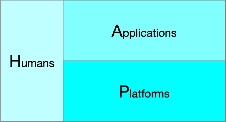 The BDAT stack is also an expression of a form of myopia by software/application architects of yore, especially the architects who created the orthodox architecture frameworks. These architects almost exclusively came from the application software engineering world. They branched out to the ‘business’ aspect as that aspect was their main driver/user and the ones paying the cheques. They also mostly ignored infrastructure as something that lower-skilled/educated engineers put together for them from stuff that came in boxes. There, they just demanded the stuff from below, as ‘the business’ did for them. So, while they created a BAT stack, what they actually were thinking of more or less was a HAP-stack: