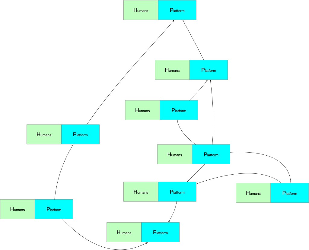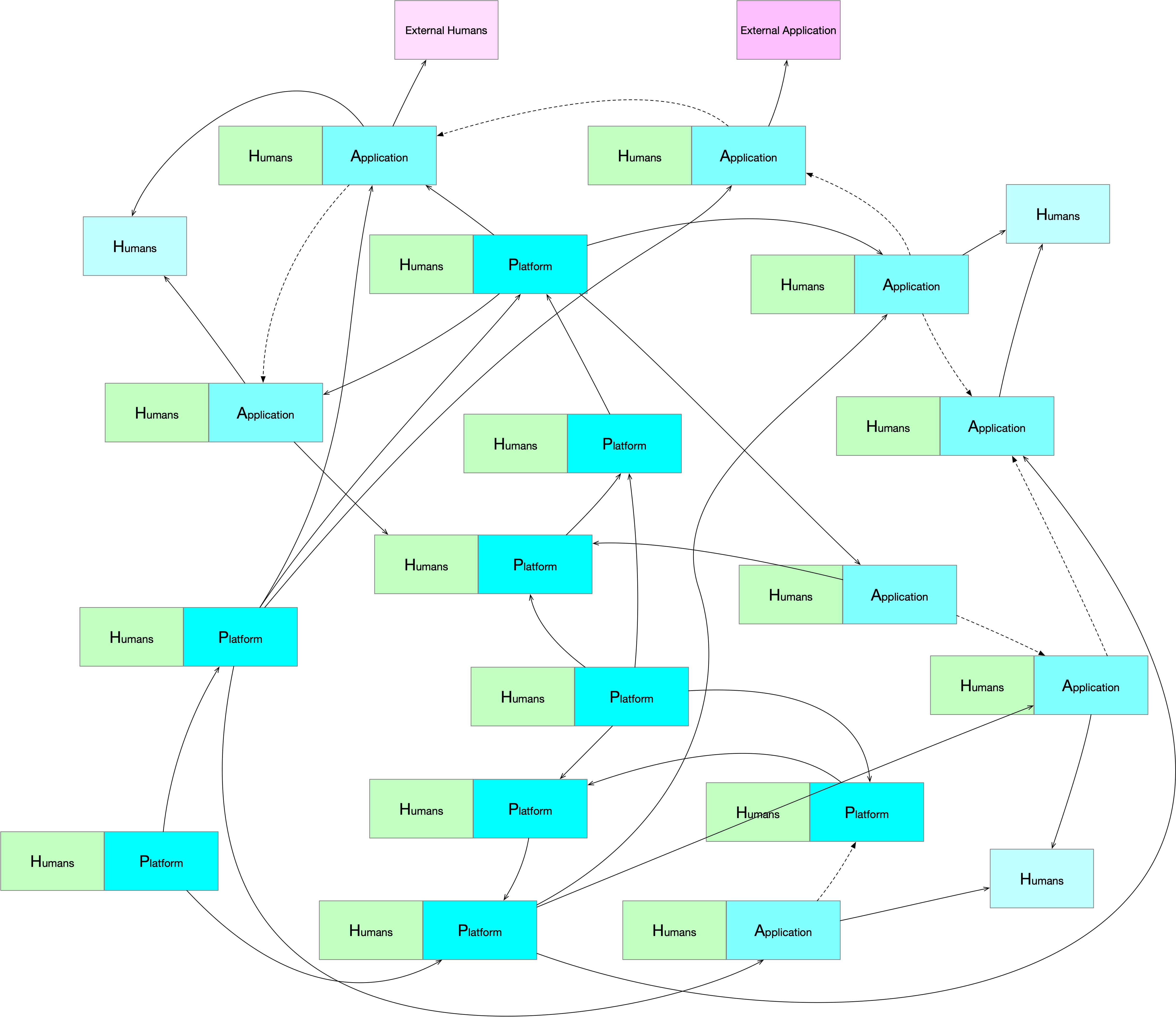 Having said that, we still do have a layering even if the humans and applications that interact with ‘the outside’ (for any value of ‘outside’) are no longer layers, but columns. Humans and IT are now working side by side (as well as interacting amongst themselves) to perform the organisation’s behaviour. But we still have layers: we have platforms that we do not expose and that are generic and are only there to support the business specific behaviour we see performed by humans and applications. Of course, if you are Microsoft Azure or AWS, you provide platforms (like kubernetes, web servers, etc.), but you still have the platforms you do not expose and that enable you to do this. After all it’s ‘turtles all the way down‘.