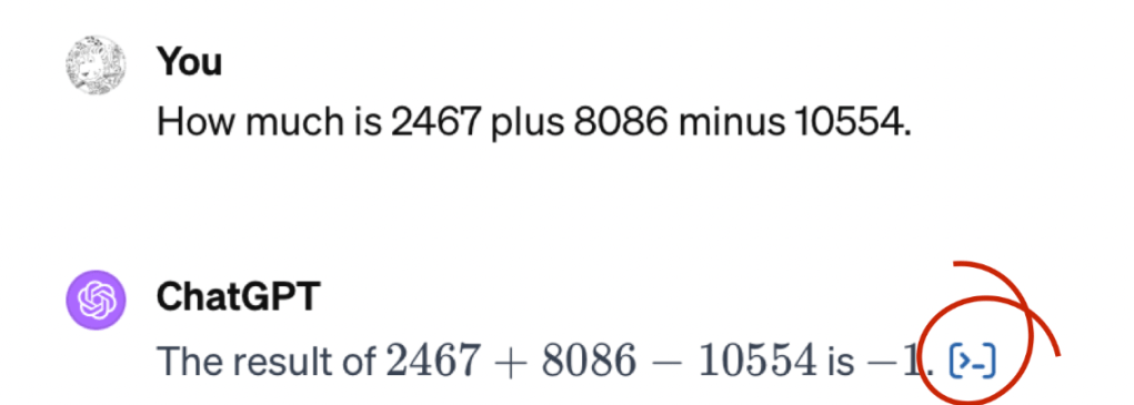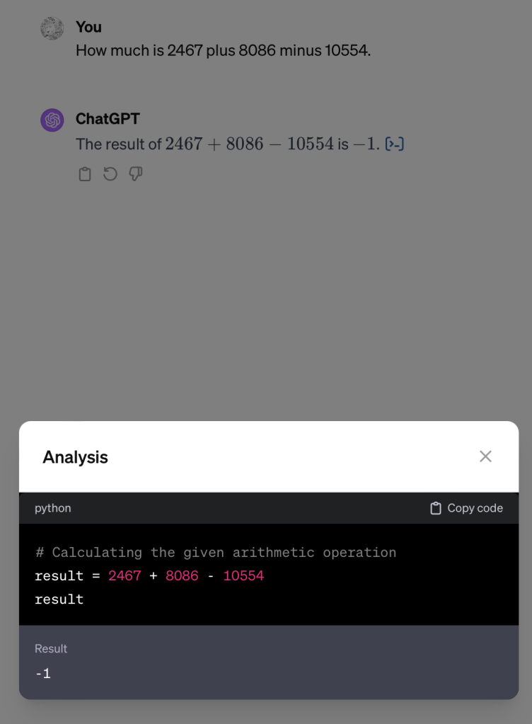 - Your prompt is analysed, looking for clues that it contains or is about arithmetic. Note: this is probably some specific tool, a bit like — or more likely an expansion of — the safety filter. Probably not an LLM itself, but a less sophisticated but more ‘exact’ technique (string pattern search, other specific parsing — if you ask ChatGPT what that is, will tell you actually it uses such basic techniques, but it is unclear if this is true of course)