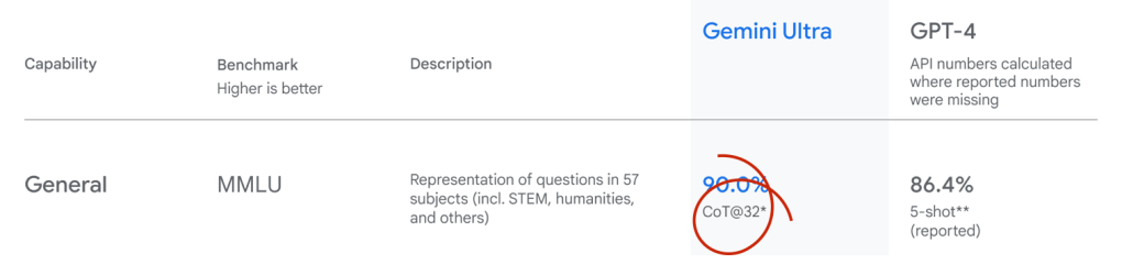 Google on the other hand, seems to still be focused on the LLM itself as well. One trick that Google pulled with Gemini is really interesting, and to be honest, I did not get it at first, I drew a wrong conclusion, now fixed in the post that described it. In that post I drew your attention to this element of Google’s reporting on beating GPT4 on benchmarks:
