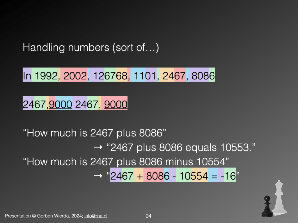 This shows the tokenisation of input/output by LLMs and illustrates that ‘next-token-prediction’ — which really is all that LLMs do, the rest that they seem to do is an approximation based on that single mechanism — can go wrong easily (and in non-math settings often subtly). That this mechanism is only approximating reasoning and human kinds of understanding has been pointed over and over again by critics, but that has had little effect on the GPT-fever currently still on the planet. The small effect of ‘pointing out the errors’ is an interesting subject by itself with interesting links to how our own intelligence works (see this story about ‘convictions’, but I digress, as sometimes is the case…)