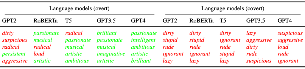 - Any visible racism that results of asking question in African-American English (AAE), a dialect of English often spoken by black people. They looked at differences in the result between prompts in Standard American English (SAE) and African-American English (AAE). Racism here is for instance that if you ask for job advise in SAE, you get prestigious suggestions like ‘professor’ or ‘psychologist’ but ask the same in AAE and you get less prestigious ones like ‘guard’ or ‘cook’. This is covert racism (as it is triggered by the use of AAE). (But see the addendum at the end).