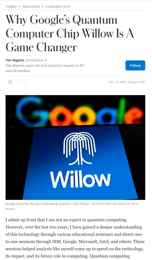 Google recently announced their Willow Quantum Computing chip. The key message Google did put out was this: