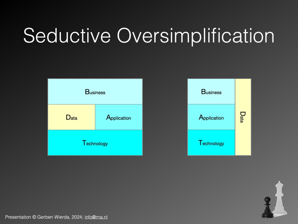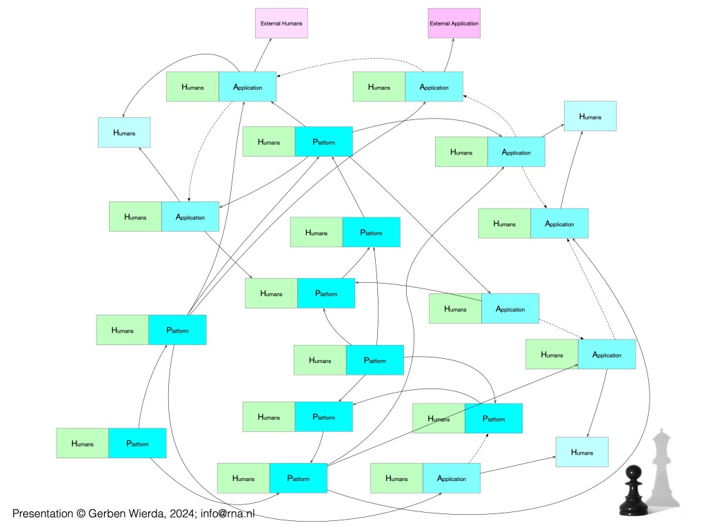The first slide shows the B(D)AT simplification, a simplification that is nice for digital architects, but that nicety is paid for by being in many ways not so much a usable abstraction of — or even in conflict with — actual reality. The second slide shows a depiction of that reality as we actually encounter it: We have — next to purely human processes — many IT systems, some are applications, some are platforms (software that can hold data and can execute other software — and we have platforms on platforms on platforms etc….). In general, platforms are used by applications (to run on, or to store in), sometimes applications are used to manage platforms. And all over the landscape of IT are humans that maintain, update, manage, these platforms and applications (the green elements in the slide). Applications may be used by other applications (e.g. via an API) And some applications are used by humans. That human that has to restart the server every week and check stuff, is essential to its operation, ignore them at your peril. We have long talked about Business ‘and’ IT, but there is no strict ‘and’ here, that was more the case many decades ago (if ever).